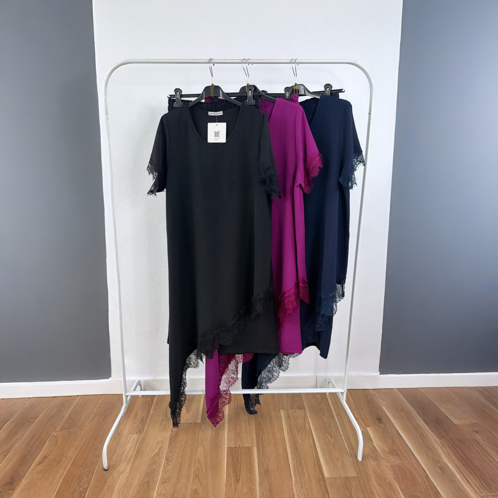 Conjunto de talla única. Conjunto de camiseta lencera asimetríca y pantalón ancho. Medidas camiseta: Largo:131cm. Ancho:52cm. Medidas pantalón: Largo:102cm. Tiro:36cm. Ancho:48cm.