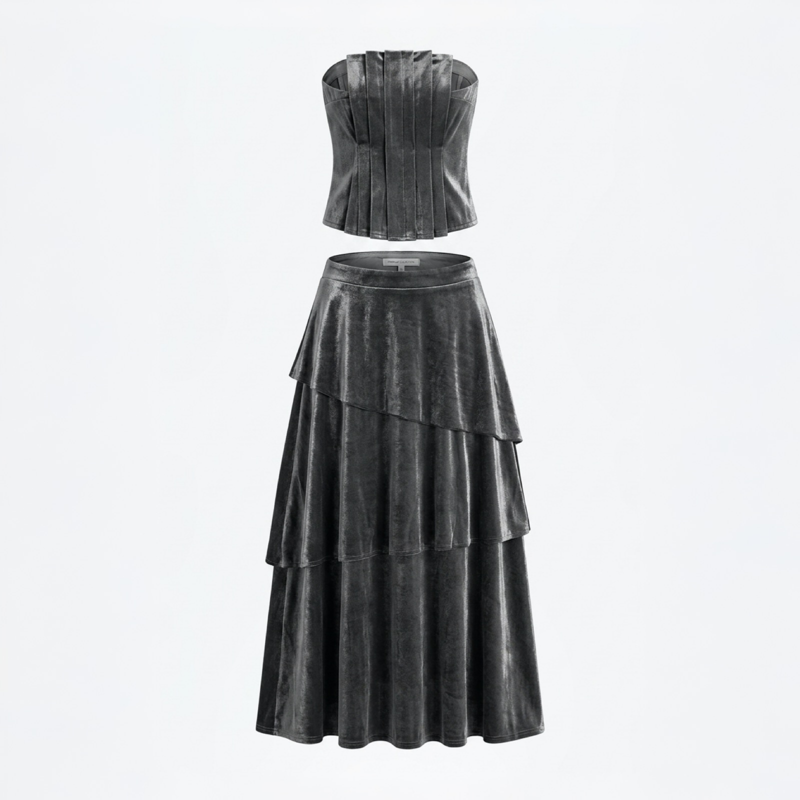 Conjunto de falda asimetríca con tres volantes de tela salvaje,y ton de palabra de honor con pliegues en la parte delantera y con fruncido en la parte de atrás.