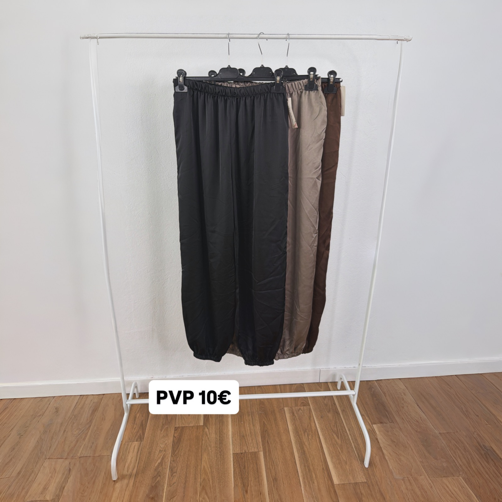 Pantalón talla única,de raso bombacho en la parte de abajo y con elástico en la parte de arriba.