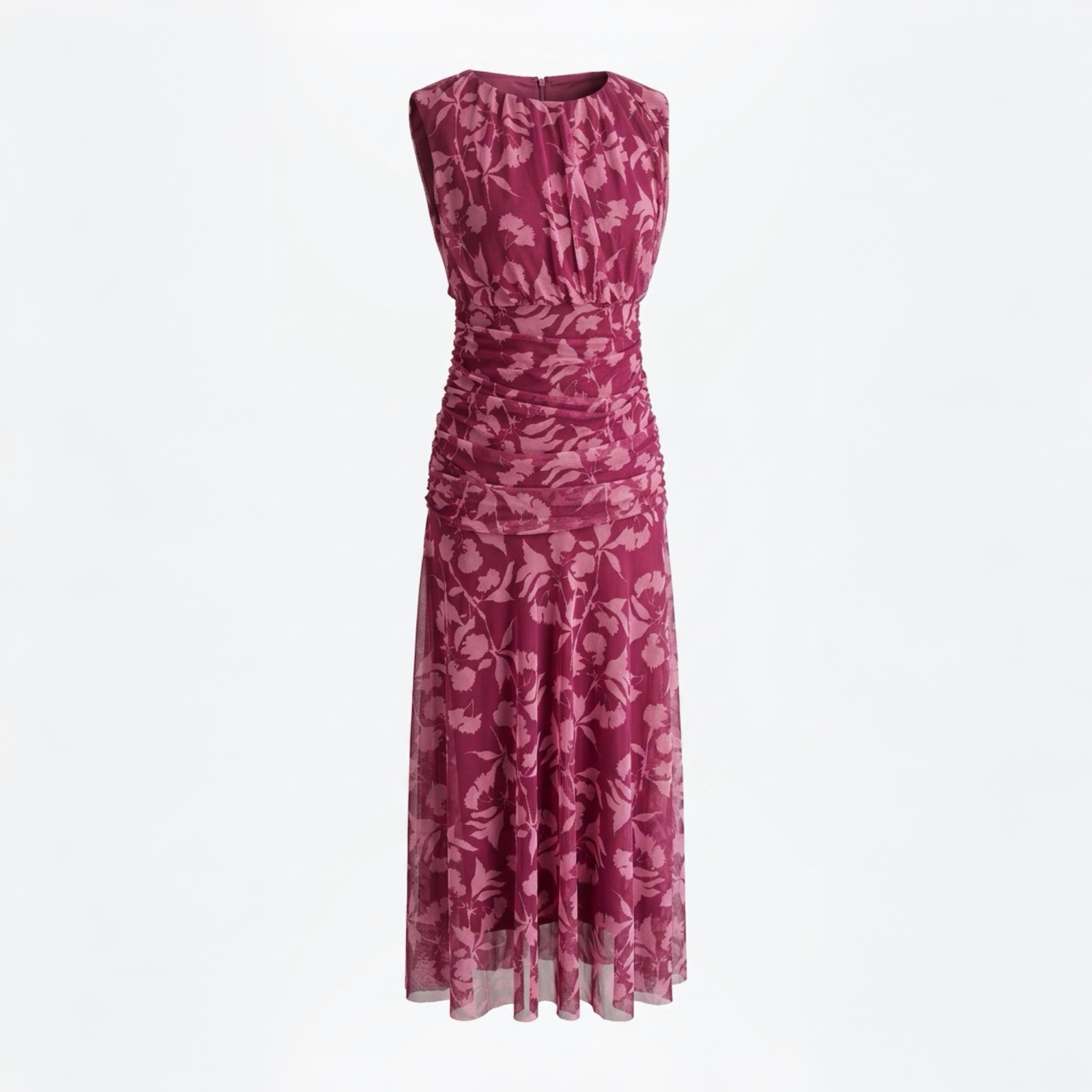 Vestido de gasa con forro por debajo y con fruncido en la parte de la cintura.