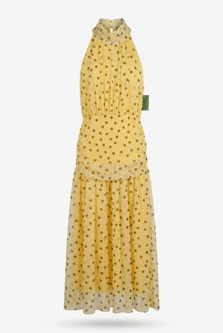 Vestido talla única. Vestido de gasa de lunares en blanco con el lunar en negro,con cuello halter con cierres en el cuello de lazo ,con fruncido en la parte de la cintura. Medidas: Largo:131cm. Ancho:44cm.